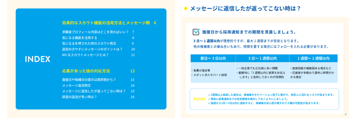また、GUPPYで人気の「気になる!」機能を活用したスカウト事例や、返信をもらいやすいメッセージ例文も用意。医院名や特徴をわかりやすく冒頭で伝える工夫、求職者の希望条件に合わせたアプローチの仕方など、すぐに活用できるテンプレートを複数掲載しています。