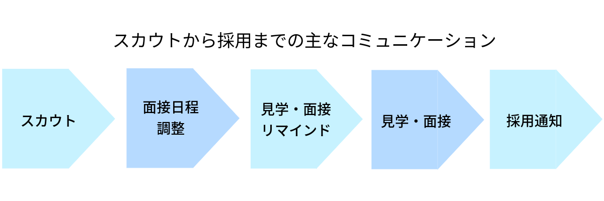 スカウトから面接、採用までのこまめなコミュニケーションが、採用の成否を分ける一つのポイントとなっています。 先を見越した「メッセージのやり取り」を、本資料では時系列で解説します。
